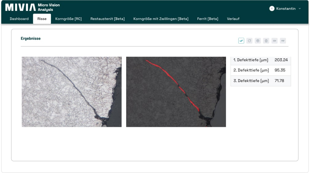 MiViA erkennt den Gefügeübergang automatisch und setzt eine präzise Messlinie für die Randentkohlung.